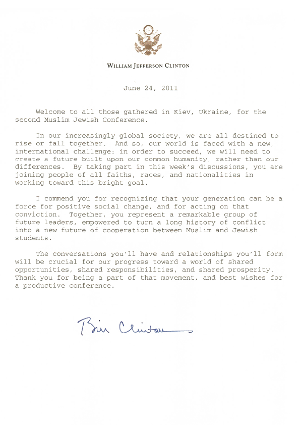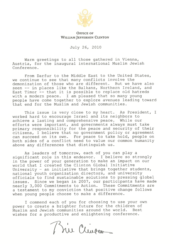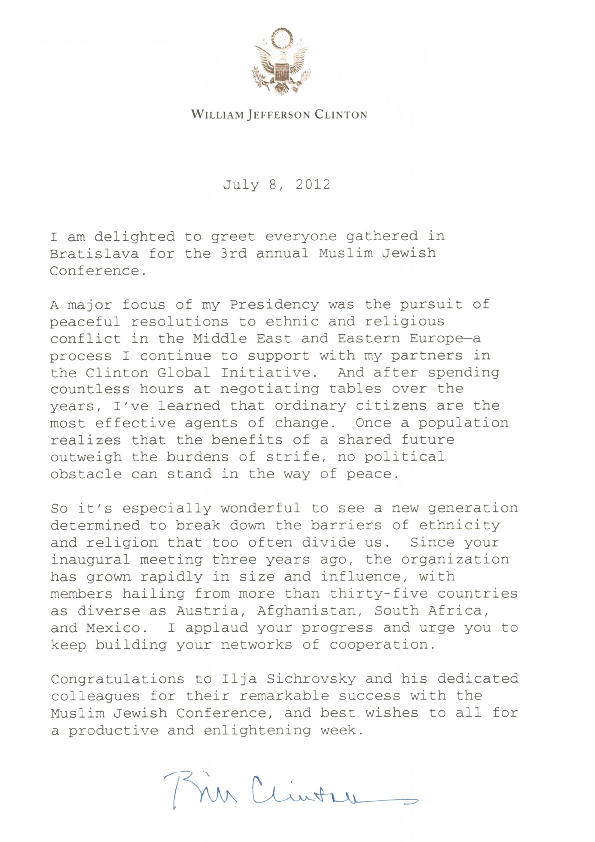 Former US President Bill Clinton has been a consistent supporter of the Muslim Jewish Conference since its inception, and has sent a letter to the conference every year.